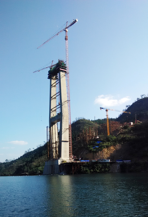 红水河特大桥两侧桥墩高度均为210米,每个桥墩的起重机械配置均为leyu-乐鱼(中国)官方网站_leyu.com生产的一台C7036塔机、一台C7030塔机和两台SC200/200WPZ中速变频施工梯,副墩的施工机械为一台P125平头式塔机。 承担主施工吊装作业的C7036塔机,最大起重量16吨,工作幅度为70米,C7030塔机最大起重量16吨,起升高度为220米,工作幅度为50米,两台塔机交叉式布置,覆盖面大,C7036塔身断面2.5米,主弦为圆钢,C7030塔身断面2米,主弦为角钢,机构配置均采用变频无级调速系统,启动、制动平稳。